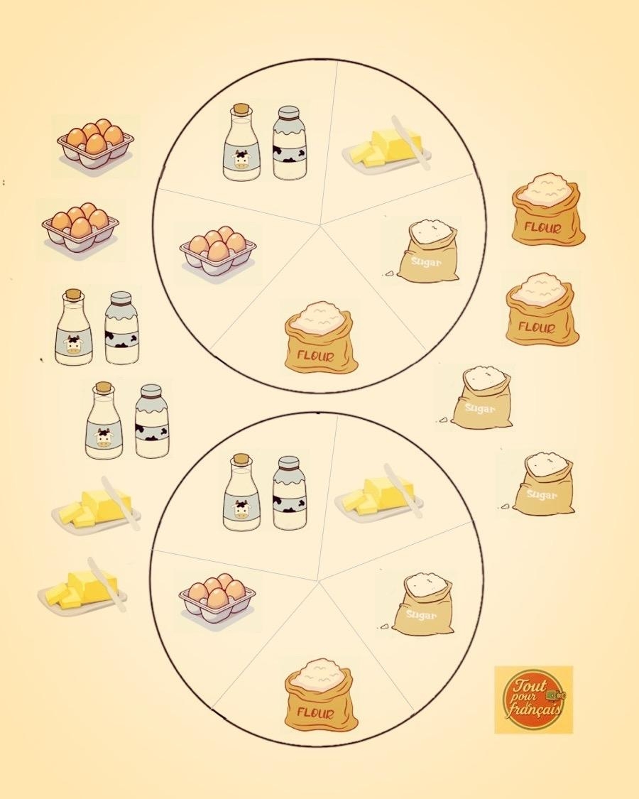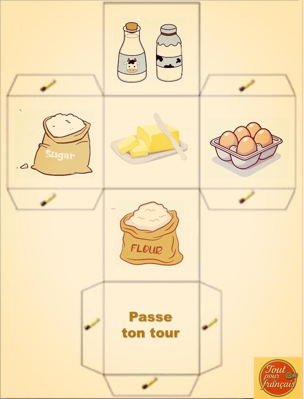 Objectif: Reconstituer les ingrédients nécessaires pour préparer une pâte à crêpes en jouant avec le dé.