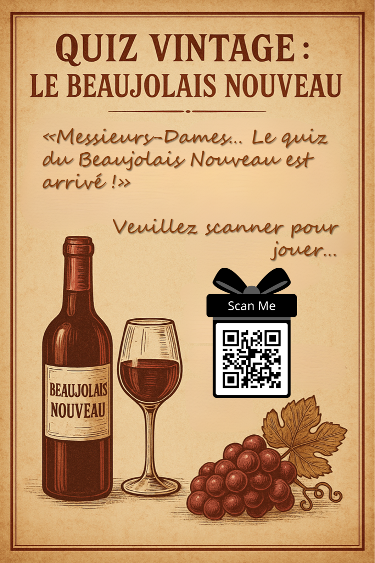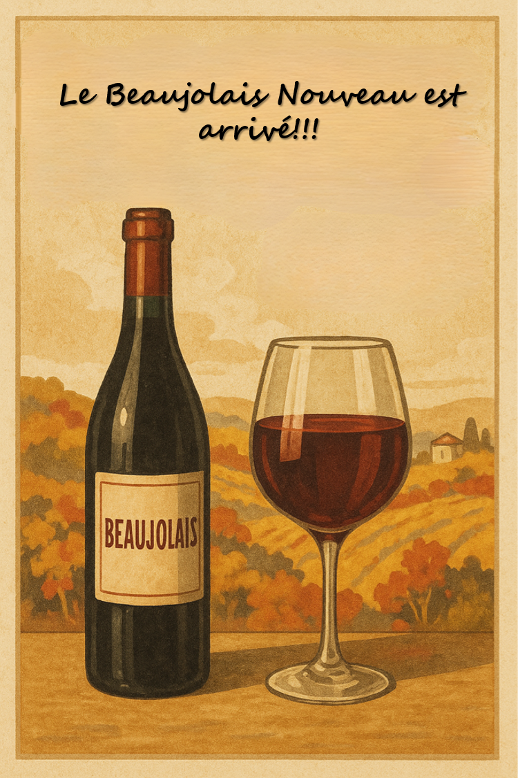 Le beaujolais nouveau est un vin produit dans le vignoble du Beaujolais. La commercialisation se fait immédiatement à la fin de la vinification. Il est mis en vente dans le monde entier le 3ème jeudi de novembre. Les Français sortent ce soir-là pour fêter l'arrivée du Beaujolais!!!