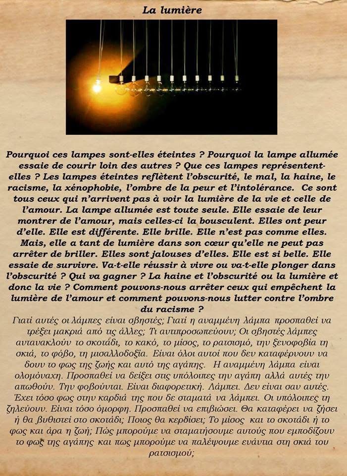 Une activité faite par mes élèves au Centre des langues étrangères Maria X. Dimitriou où je travaille actuellement. On a participé à un concours Panhellénique avec le titre ''Lumière''. Cette activité nous a permis de remporter un Prix spécial (parmi les meilleures écoles de la Grèce) dont on est très fier!!! Voilà notre activité ci-dessous: