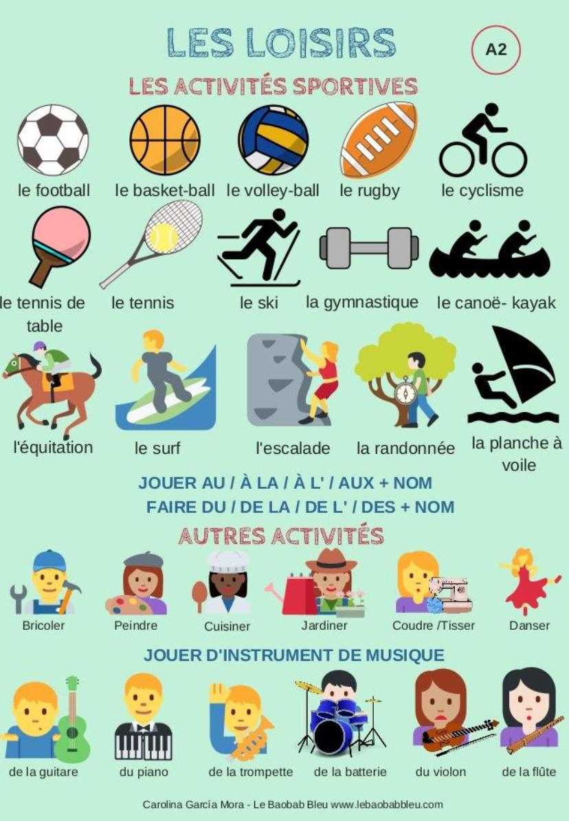 Faire de+tous les sports: (ex.: du football, du basketball, du tennis, du ski, de la boxe, de la natation, du judo, de la musculation, du vélo