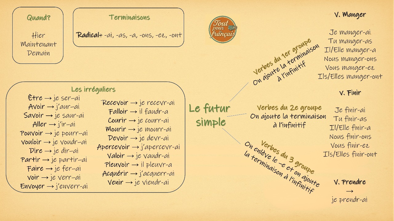 FUTUR SIMPLE VIDEO Présentation du futur simple Activ ités Verbe manger au futur Jeu Apprendre les verbes irréguliers Les irréguliers Quiz Mon weekend Moi dans 10 ans! Chanson Cartes aléatoires pour faire une révision Futur simple ou Futur proche Futur simple vs Futur proche